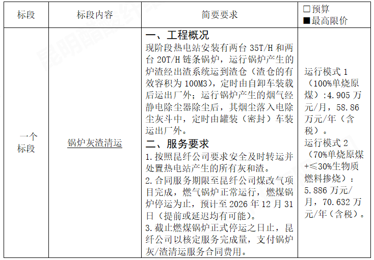 3.2交貨期: 服務(wù)期限至昆纖公司煤改氣項(xiàng)目完成,燃?xì)忮仩t正常運(yùn)行,燃煤鍋爐停運(yùn)為止,預(yù)計(jì)至2026年12月31日(提前或延遲均有可能)。