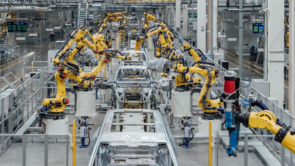 2024年2月26日在重慶市兩江新區(qū)拍攝的賽力斯汽車超級(jí)工廠焊裝車間生產(chǎn)線(無人機(jī)照片)。新華社發(fā)